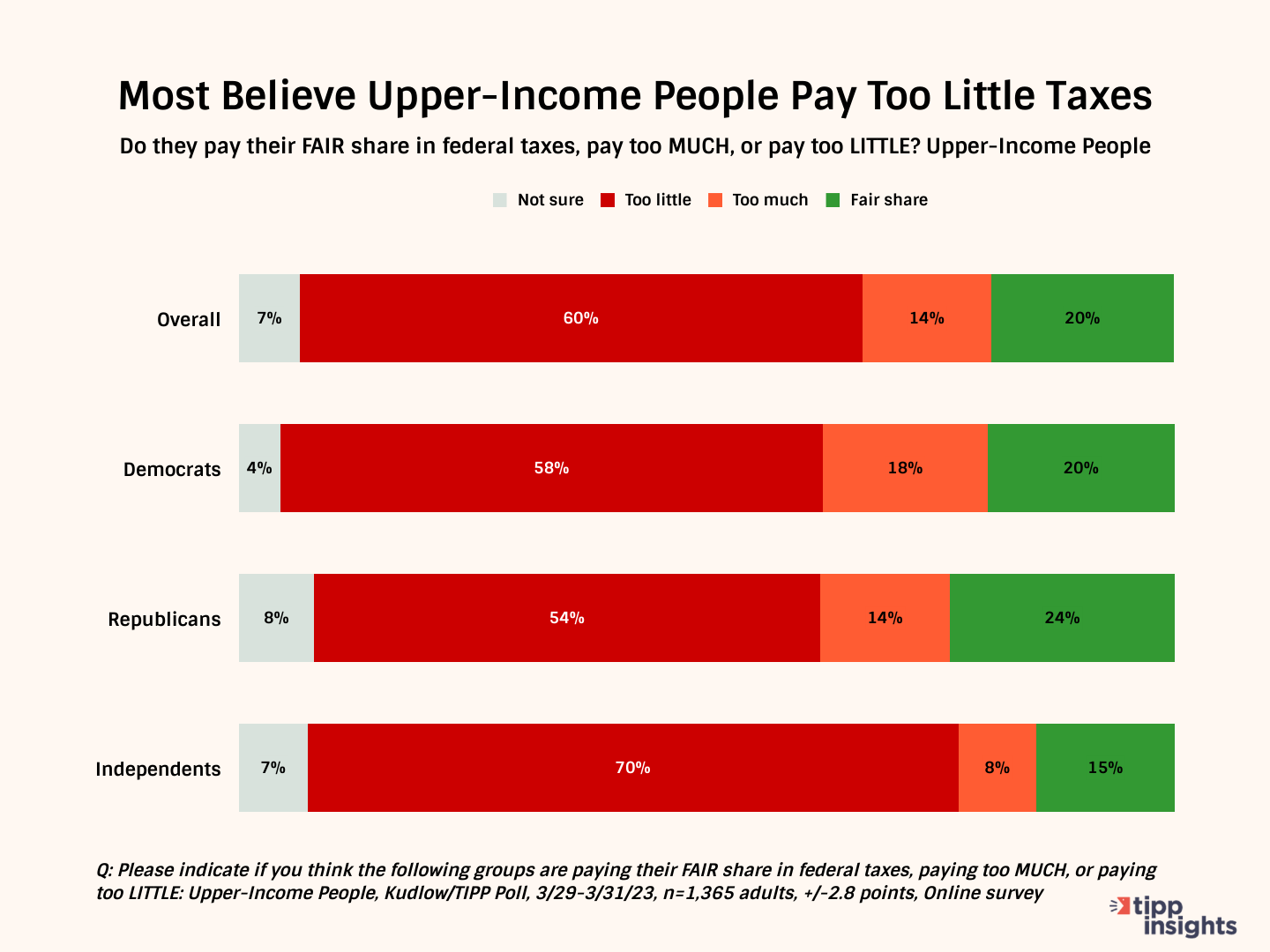 Six in ten Americans believe that upper-income individuals are not paying enough taxes; one in five (20%) think they pay their fair share, and another 14% say they are taxed too much.