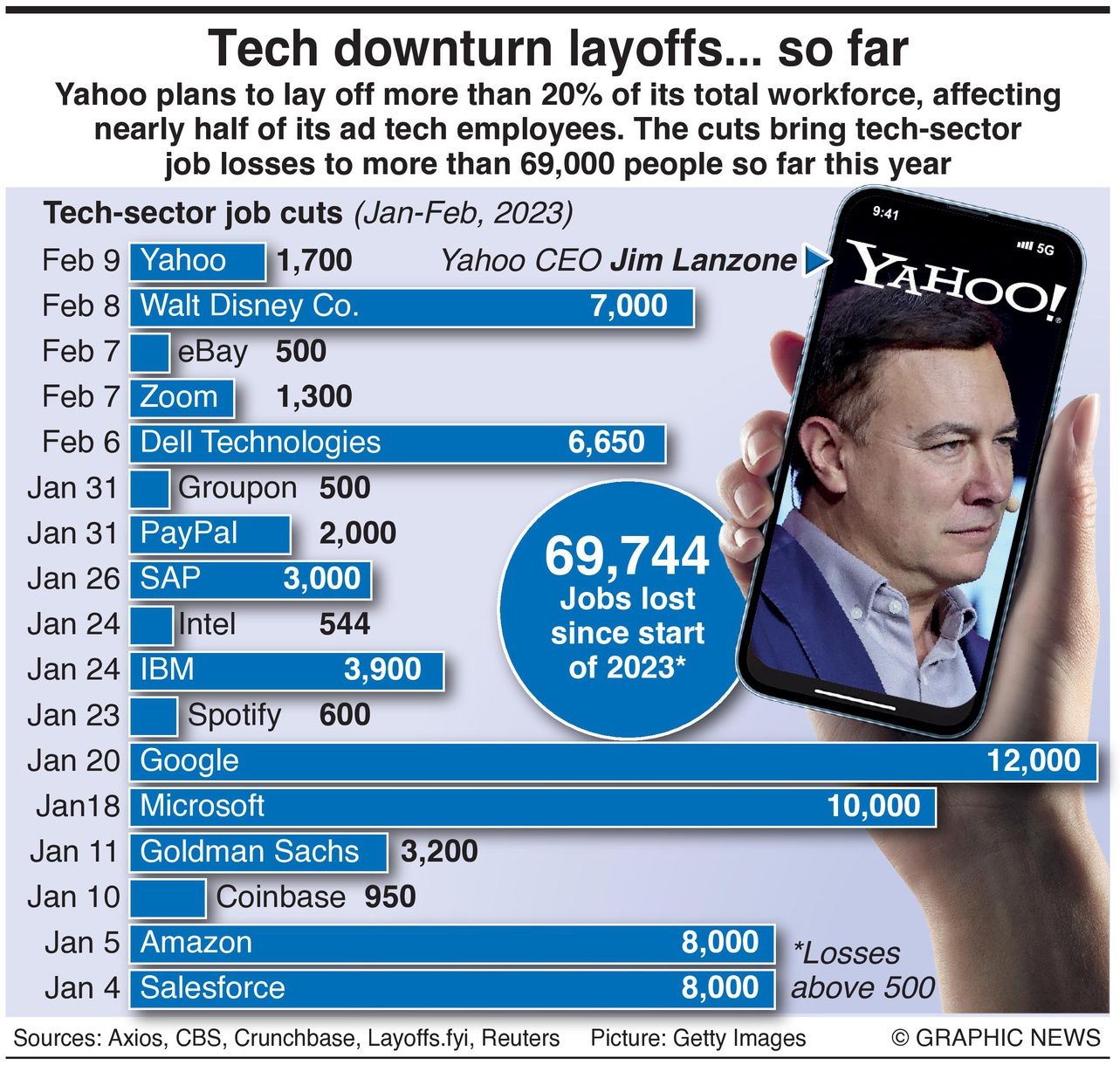 Yahoo plans to lay off more than 20% of its workforce, affecting nearly half its ad tech employees. The cuts bring tech-sector job losses to more than 69,000 people this year.