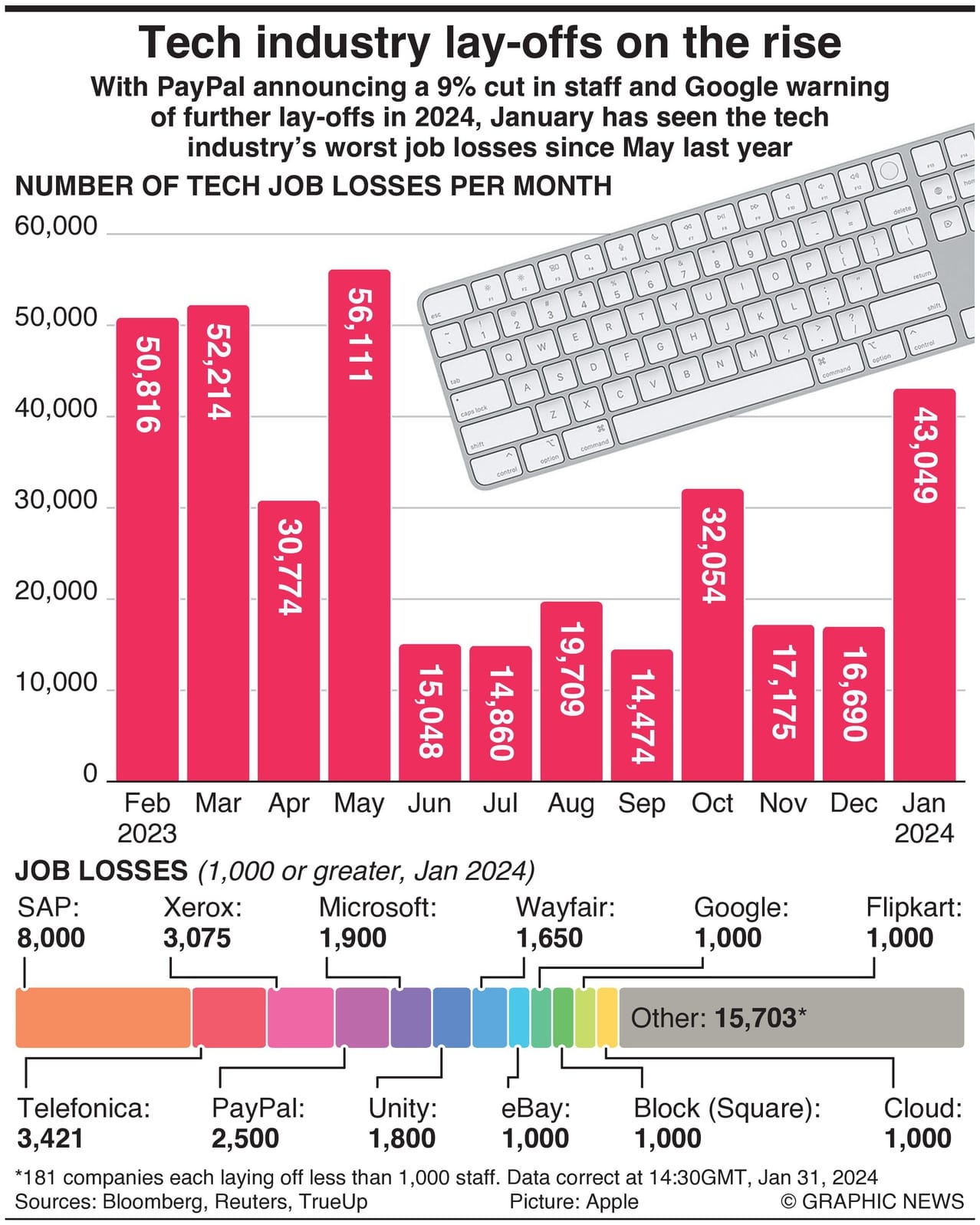 January has seen over 43,000 tech jobs go in the highest round of redundancies since more than 56,000 employees were dismissed in May 2023.