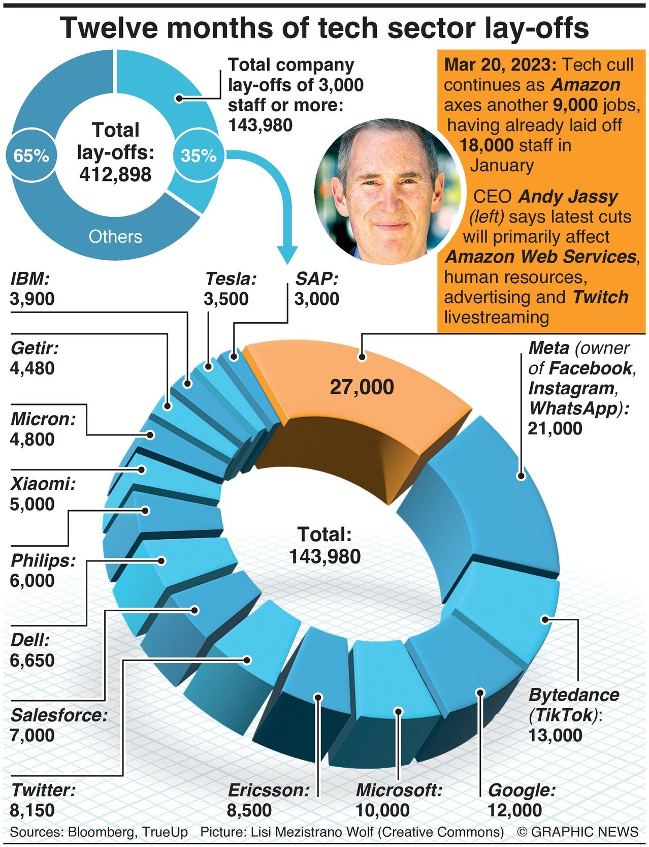 Amazon is to make another 9,000 workers redundant on top of the 18,000 staff it laid off two months ago – taking the number of tech sector job losses in the past 12 months to more than 400,000, according to the TrueUp tech lay-off tracker.