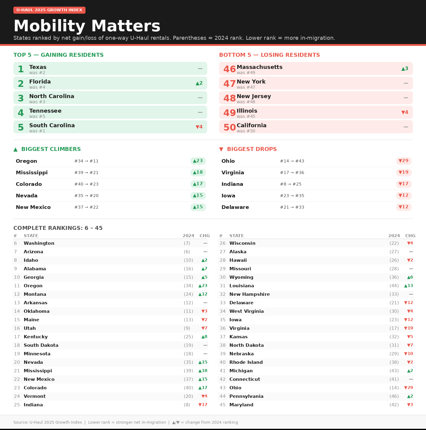 U-Haul’s 2025 Growth Index ranks states by net one-way moves, a proxy for domestic migration. Texas leads, followed by Florida and the Carolinas, while California ranks last for the second straight year. The pattern underscores continued population shifts toward the South and Mountain West.