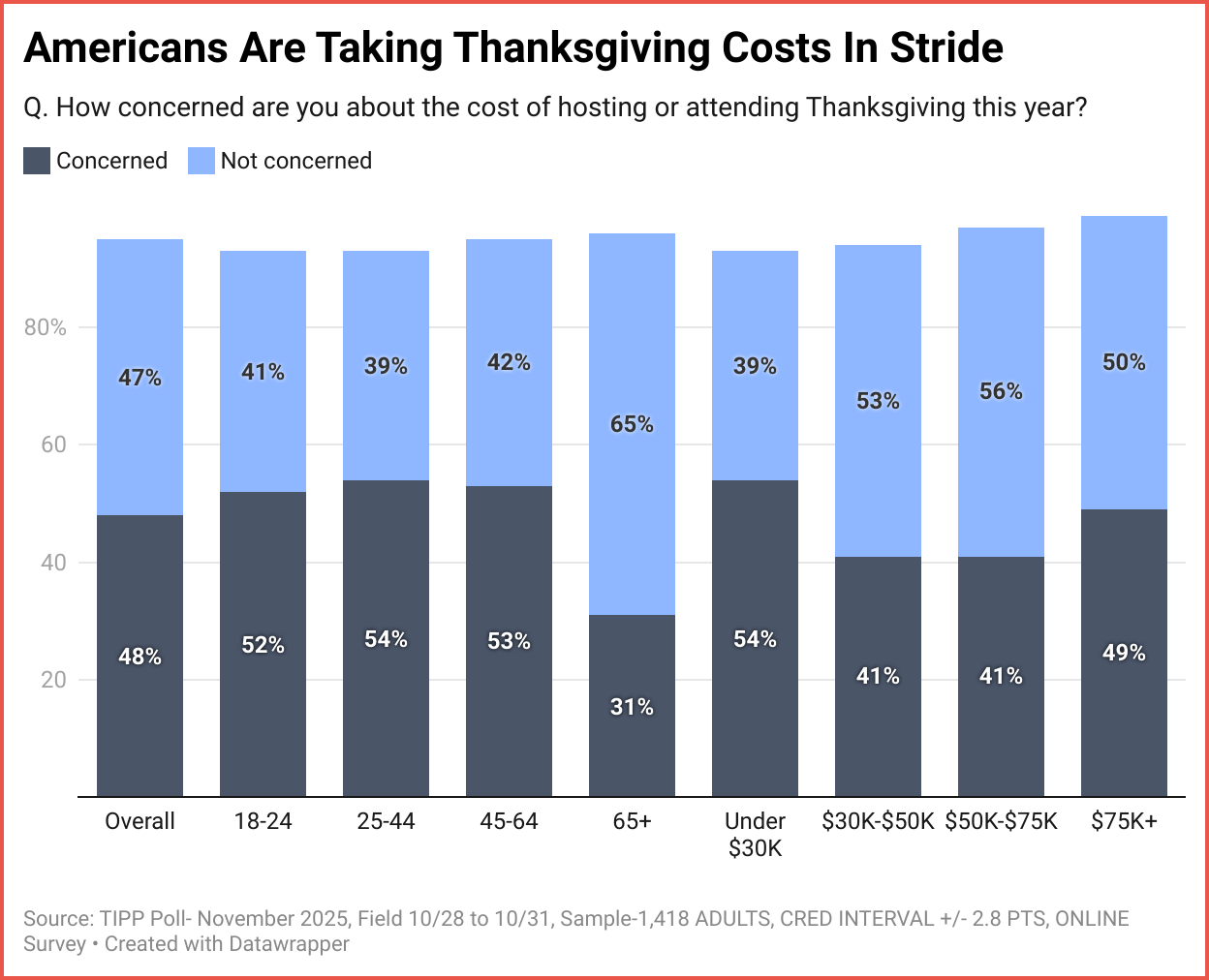 Americans are almost evenly divided on whether they are concerned or unconcerned about the cost of hosting or attending Thanksgiving this year. While 48% said they were concerned about the costs, 47% were not. Almost a quarter (24%) were ‘very concerned,’ meanwhile, another quarter (23%) were ‘not at all concerned.’