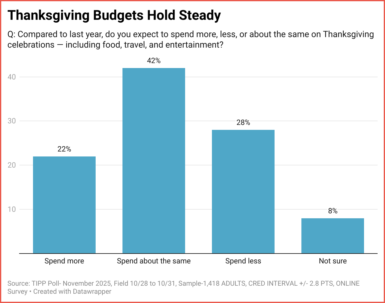 With Thanksgiving just around the corner and people making plans for travel and celebrations, TIPP Poll conducted a nationwide survey of over 1,400 adults to gauge whether the current economic conditions are influencing people’s plans for the holiday.