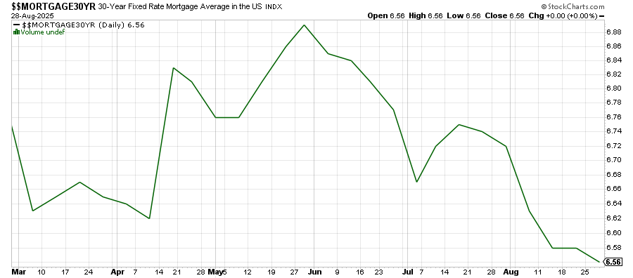Average rate on the benchmark 30-year fixed mortgage fell to 6.56%, says Freddie Mac.