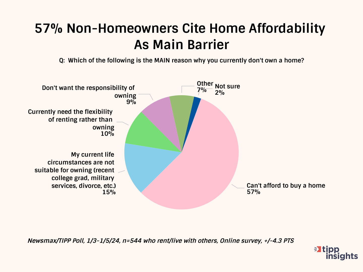 Buying a home is a big decision and one that is influenced by many factors. While there were many reasons for the significant percentage not owning a house, a clear majority, 57%, said they could not afford a home despite their wish to do so. Current life situations like military service, divorce, etc., kept another 15% from owning a residence. A tenth found renting to be more suitable to their life right now. Another tenth, or 9% to be exact, simply did not want the responsibility of owning a house.