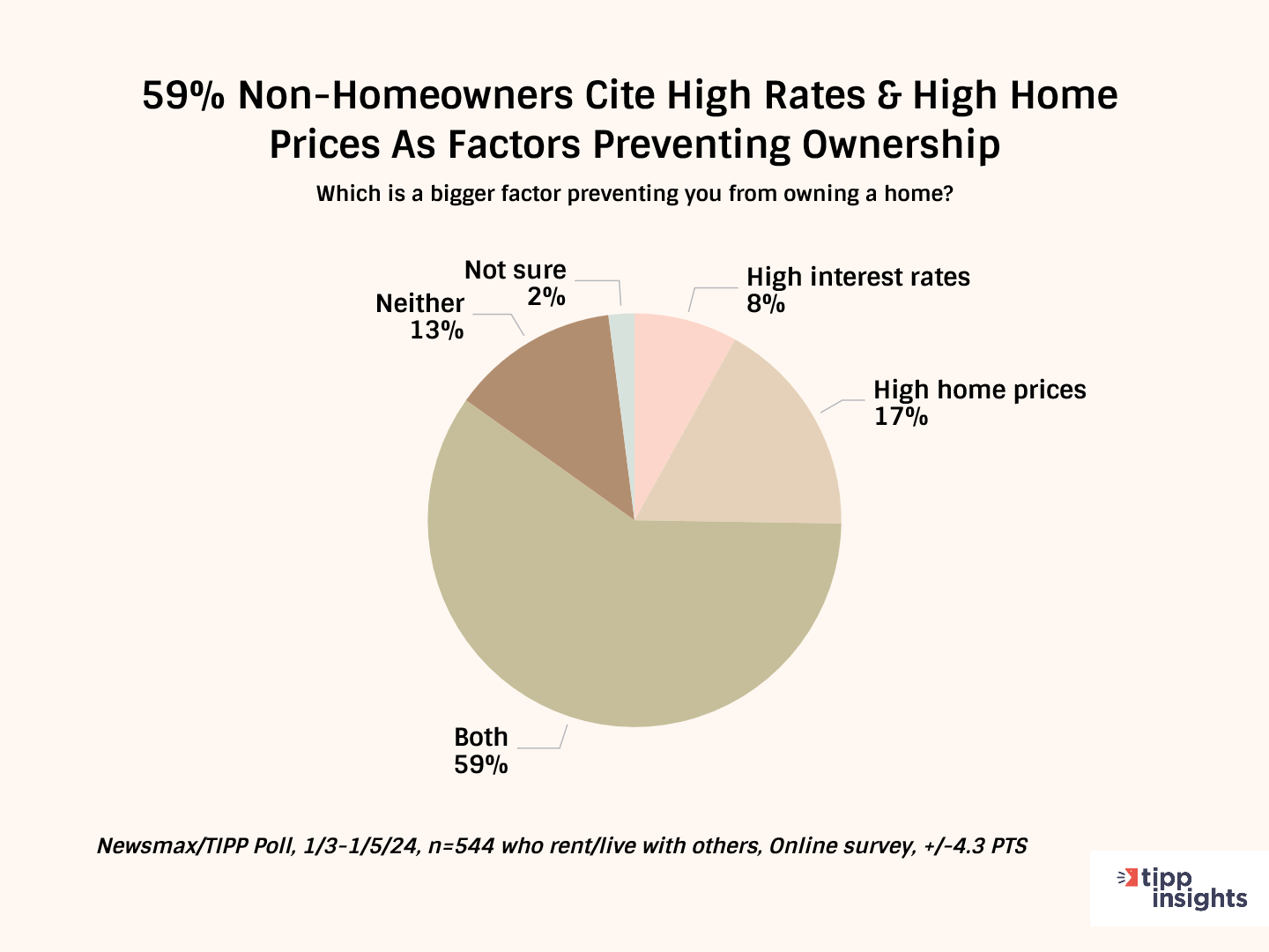 High prices deterred 17%, and 8% were discouraged by the high-interest rates, while a majority, 59%, stated that the combined effect of high home prices and high-interest rates prevented them from purchasing a residence.