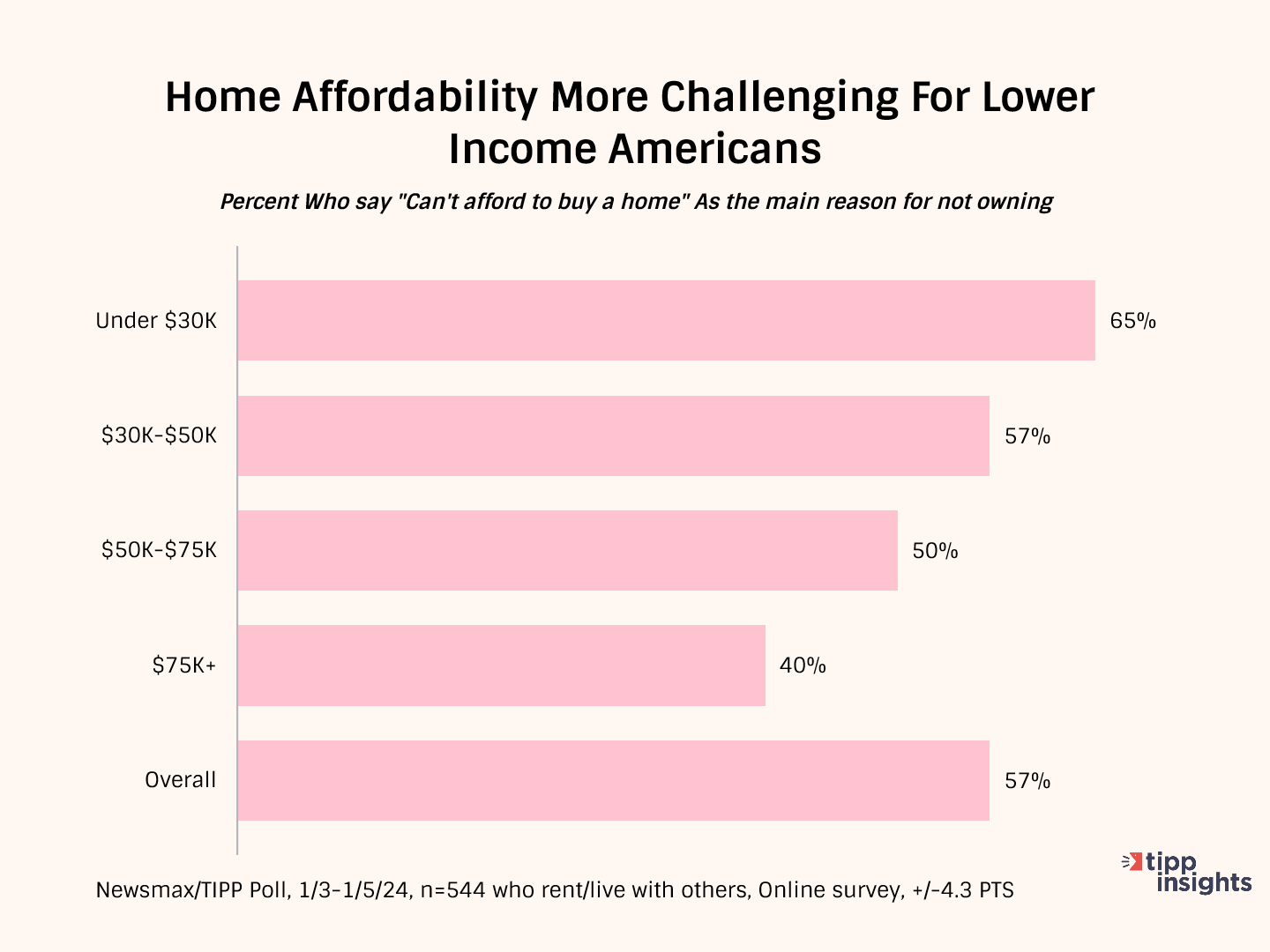 About two-thirds of those in the lowest income bracket (less than $30K) and more than half (57%) of those in the $30K-$50K income segments simply “cannot afford a home.” These numbers paint a sad picture, as many low-income families may never enjoy the stability and security of owning a home.