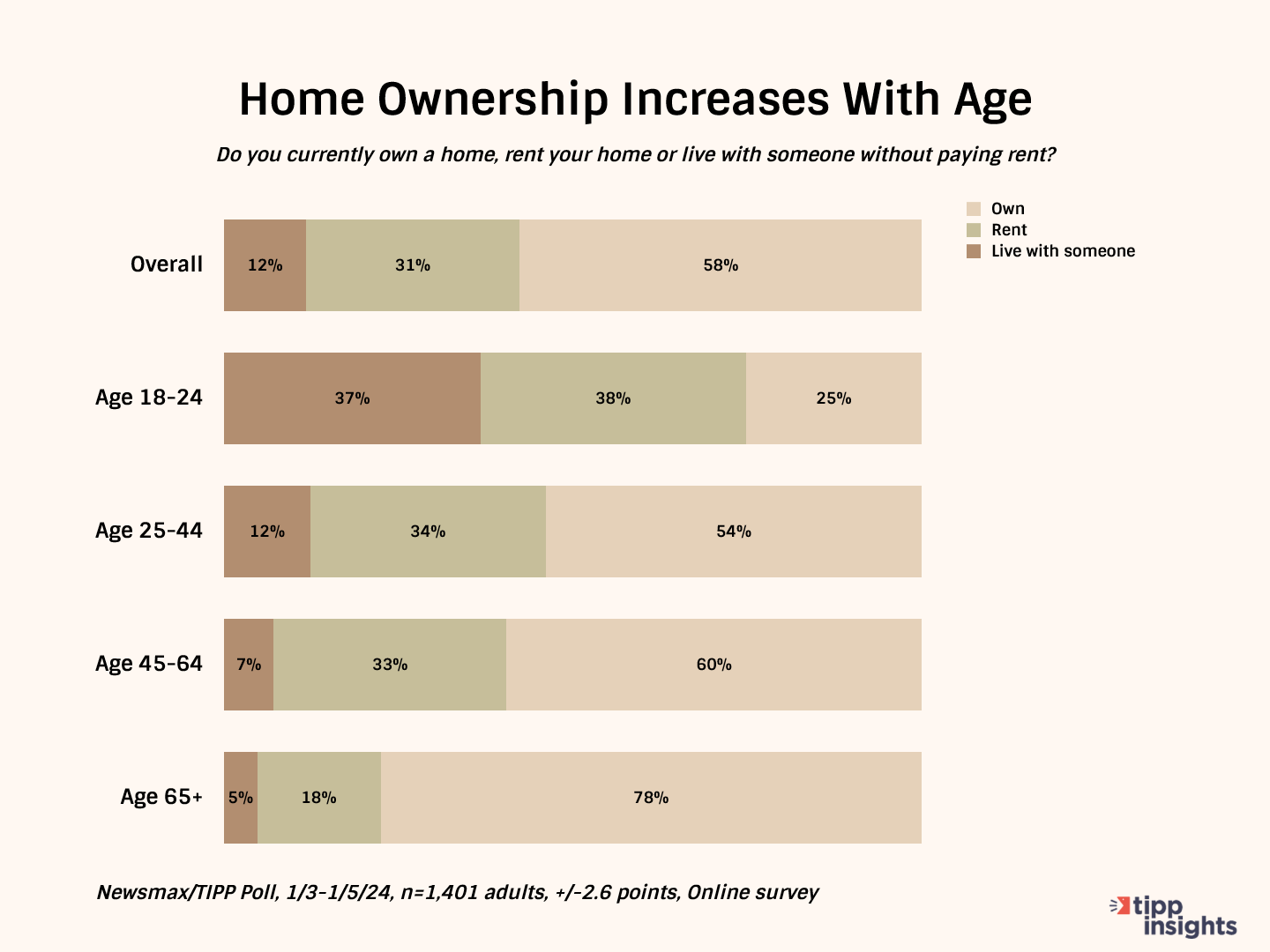 While the dream and desire may be widely prevalent, the reality is that of the 1401 survey respondents nationwide, only 58% own a home. Almost a third, 31%, live in rented accommodations, and another 12% currently live with family or have a roommate.