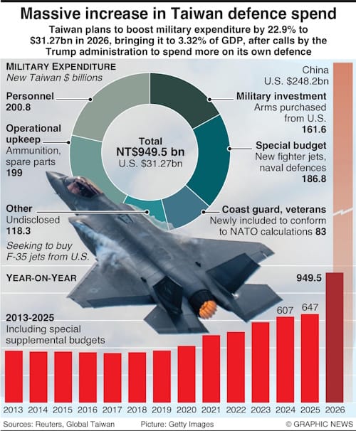 Taiwan plans to boost military expenditure by 22.9% to $31.27bn in 2026, bringing it to 3.32% of GDP, after calls by the Trump administration to spend more on its own defense.