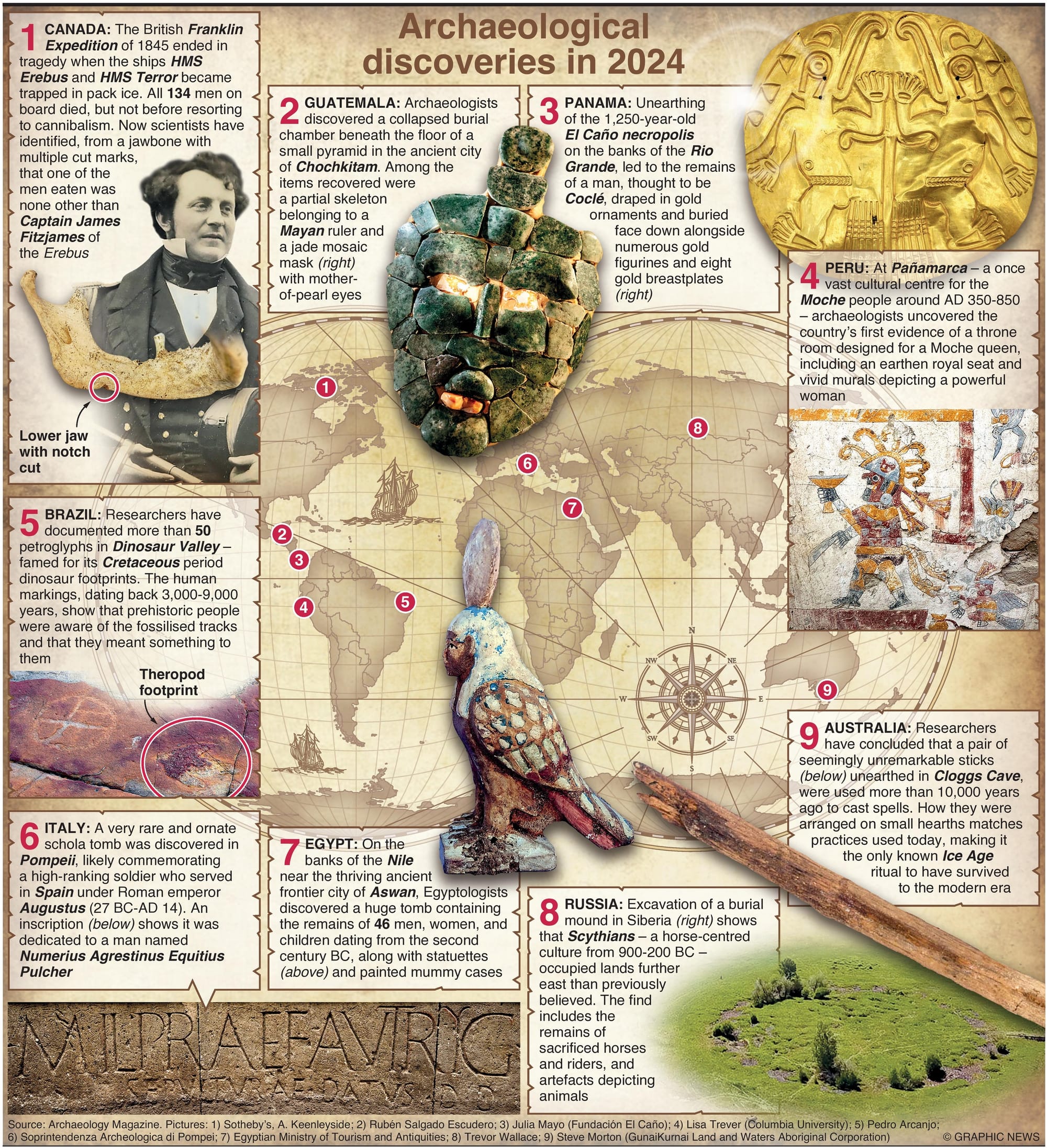 The world’s most notable archaeological discoveries in 2024 include a grisly discovery in Canada, a Mayan ruler’s jade mosaic mask, ancient petroglyphs carved among dinosaur footprints, a rare Pompeii tomb, sacrificed horses and riders, and the only known Ice Age ritual to have survived to the modern era.