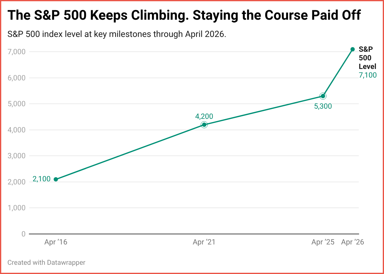That is a 34% gain in twelve months. Five years ago the index sat at 4,200. The investors who stayed the course nearly doubled their money. The ones who sold in April when sentiment hit its low point locked in losses right before one of the best weeks in two years.