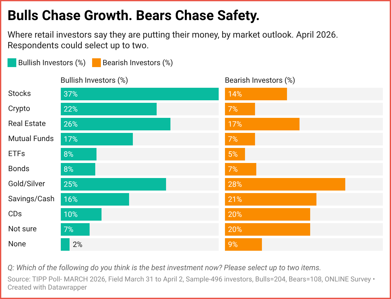 Bullish investors are piling into growth assets. More than a third (37%) say stocks are their best investment right now, more than double the 14% of bears who say the same. Crypto follows the same pattern: 22% of bulls favor it versus just 7% of bears.