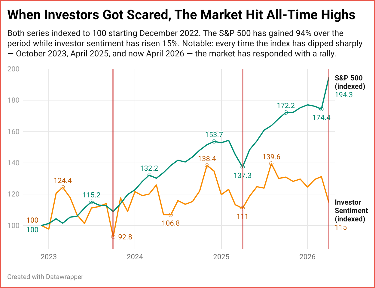What is striking is that each of the three episodes had a completely different cause. Rate fears rattled investors in 2023. Concerns about AI valuations did it in 2025. A war in the Middle East did it this April. The triggers had nothing in common. But each time, retail investors pulled back just as the market was gathering itself to move higher. That consistency is what turns a curious coincidence into something worth tracking.