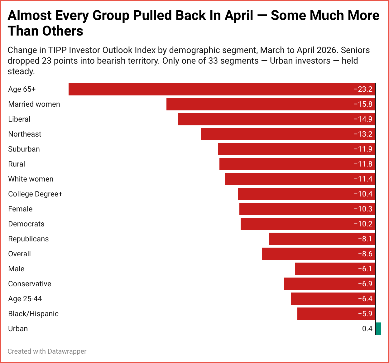 The TIPP Investor Outlook Index fell to 60.7 in April, an 8.6-point drop from March and the steepest single-month decline in over a year. The survey captured American retail investors at a moment of genuine anxiety. Seniors turned net-bearish for the first time in memory, dropping 23 points to 41.0. Women pulled back sharply. Democrats and liberals fell below the neutral line for the first time since before the 2024 election. People looking at a volatile stock market, a war in the Middle East, and rising oil prices, had concluded that things were about to get worse.