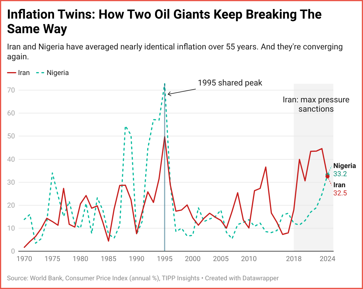 A TIPP Insights analysis of World Bank inflation data reveals a striking pattern: Iran and Nigeria, two countries with almost nothing in common politically, have been breaking the same way economically for over half a century.