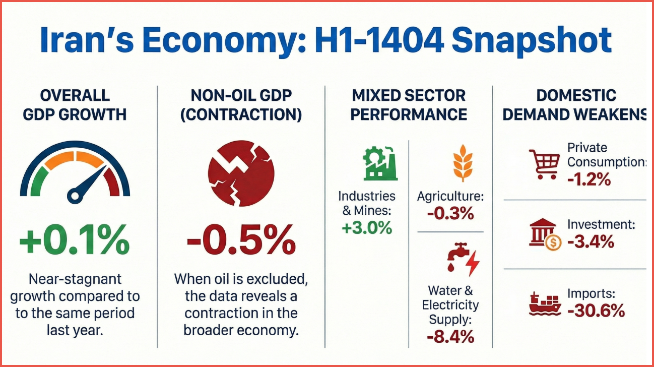Iran’s latest pre-war economic snapshot suggested a two-speed economy. Overall GDP grew +0.1%, but non-oil GDP contracted -0.5%. Imports fell -30.6%, fixed investment dropped -8.4%, and household demand remained soft. Oil was keeping the headline afloat, while much of the broader economy was under pressure even before the conflict.