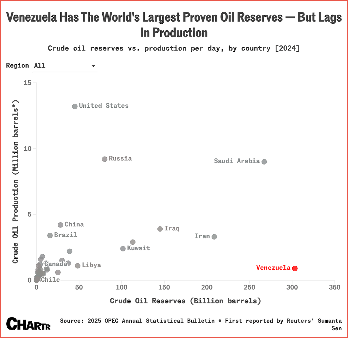 The chart exposes a brutal paradox. Venezuela holds nearly a fifth of the world’s proven oil reserves, yet produces barely 1 percent of global supply, leaving crude prices calm while investors rush to price in a long U.S.-led rebuilding of a once-great oil power.