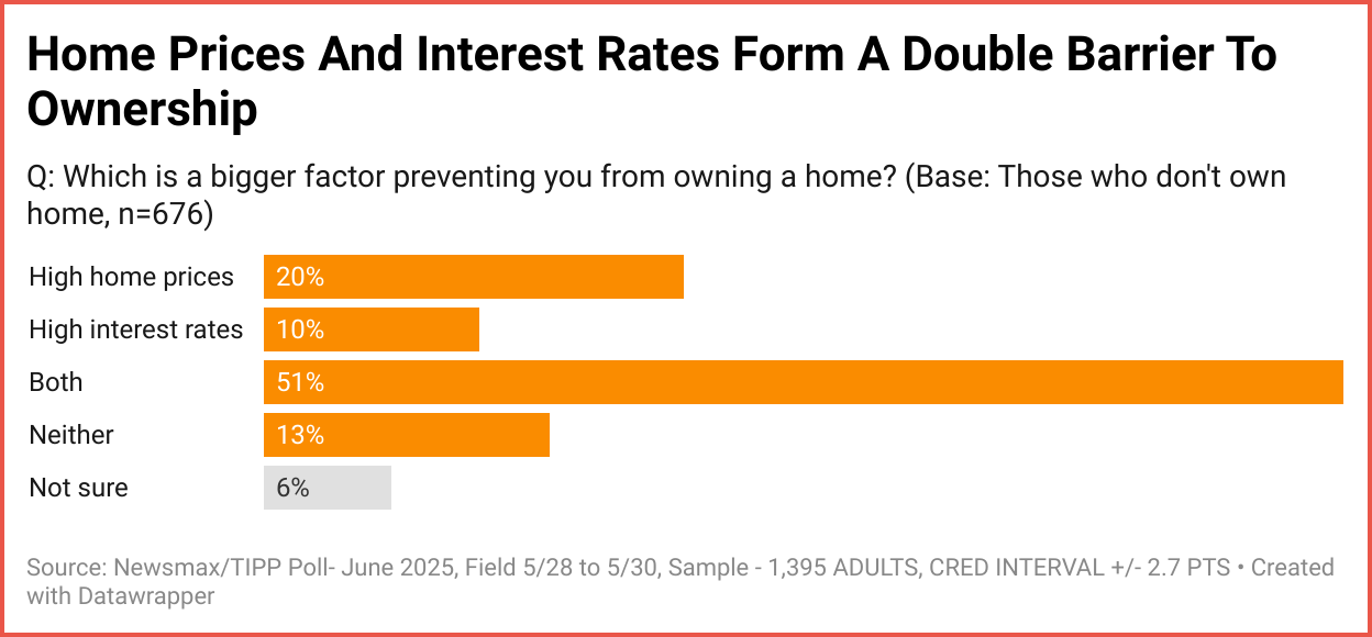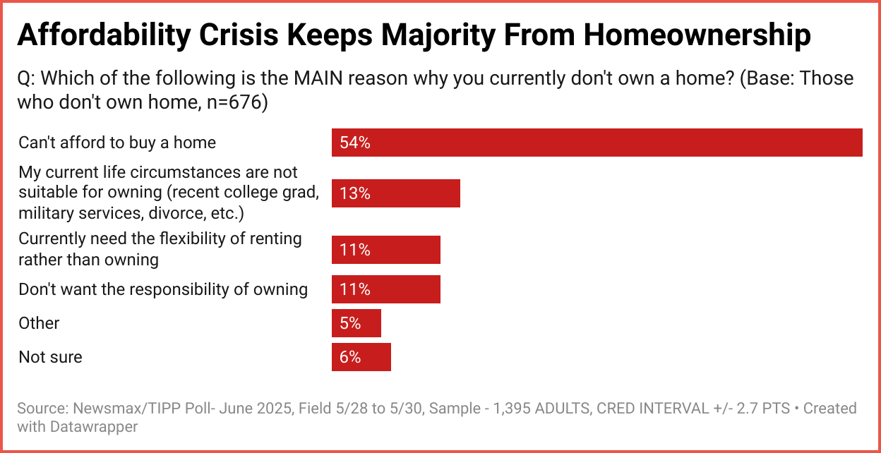 Our recent survey underscores what many families already feel daily: homeownership is harder to reach than ever before. To understand the scope and depth of the situation, Newsmax/TIPP Poll conducted a nationwide survey. The results paint a grim picture: Americans dream of owning a home, but for many, it remains out of reach.