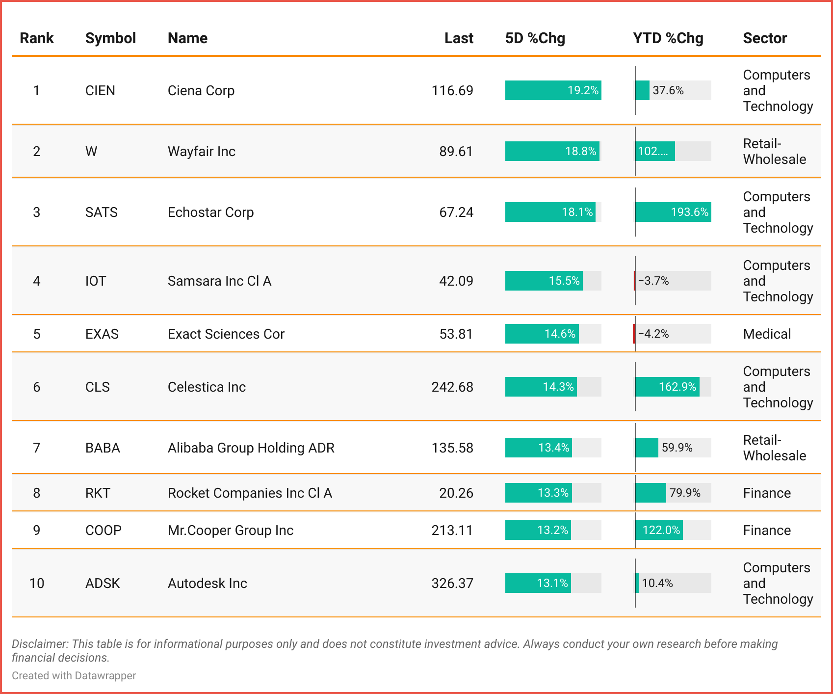 Tickers: CIEN| W | SATS | IOT | EXAS | CLS | BABA | RKT | COOP |ADSK