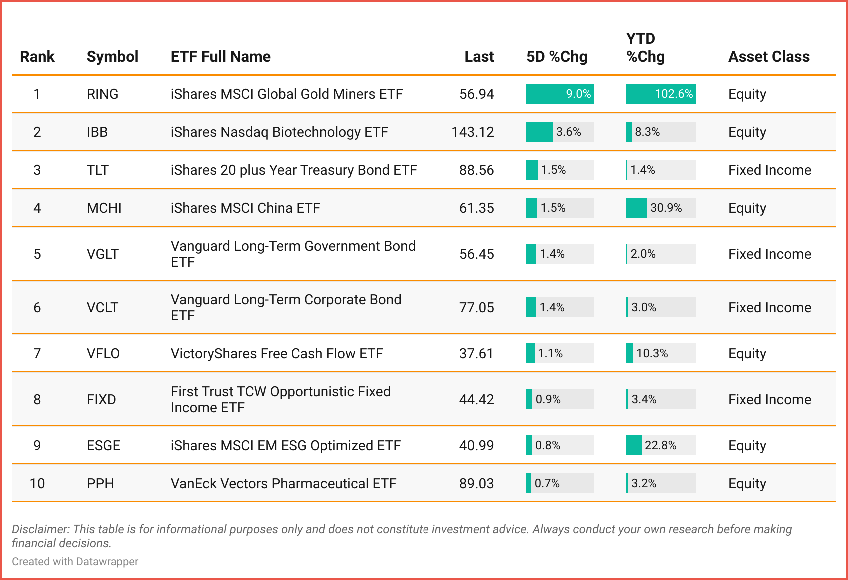 Tickers: RING | IBB | TLT | MCHI |VGLT |VFLO|FIXD |ESGE |PPH