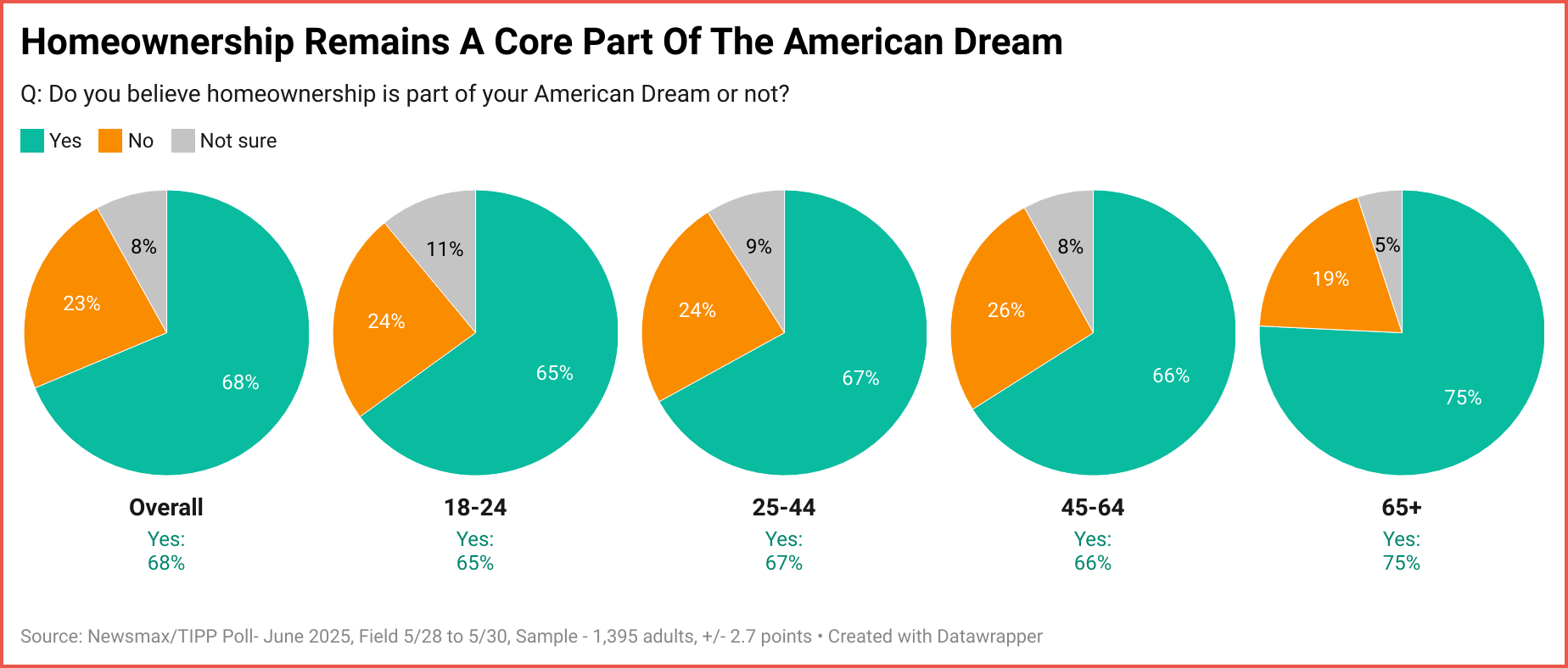 A clear majority of the Newsmax/TIPP Poll survey respondents indicated that owning a home was indeed part of their American Dream. The generational gap does not seem to have affected this particular issue, with only a 10-point difference between the youngsters (18–24-year-olds) and seniors.