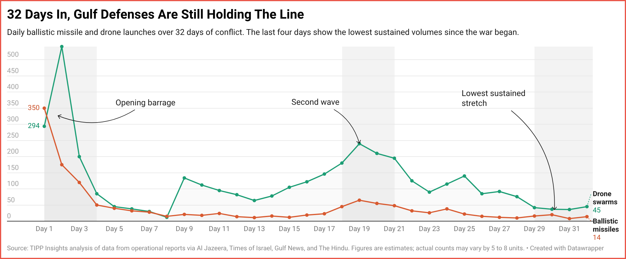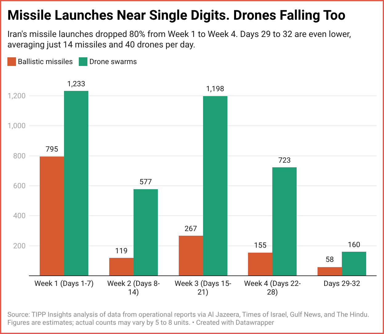 TIPP Insights analysis of weekly launch totals shows a steep and steady decline. In Week 1, Iran fired 795 ballistic missiles. In the four days since Day 28, just 58. That's a daily average of 14.5, down from 113 in Week 1. Drones are following the same path. Days 29 to 32 averaged just 40 drone launches per day, compared to 176 in Week 1. The expensive weapons are nearly spent, and even the cheap ones are thinning out.