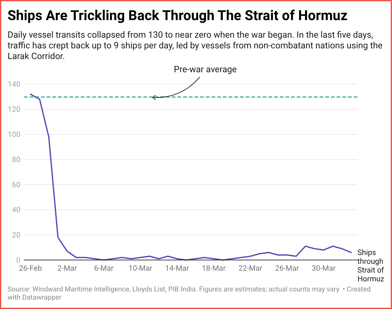 TIPP Insights analysis of daily shipping data shows a cautious recovery in the Strait of Hormuz. Before the war, around 130 ships passed through daily. By March 6, that number hit zero. For most of March, traffic hovered between 0 and 3 vessels per day. But in the last five days, an average of 9 ships per day have made the transit, including 11 on March 28 and March 31. The increase reflects the opening of the "Larak Corridor" for vessels from non-combatant nations including China, India, and Russia. It's a trickle, not a recovery. But it's the first sustained uptick since the war began.