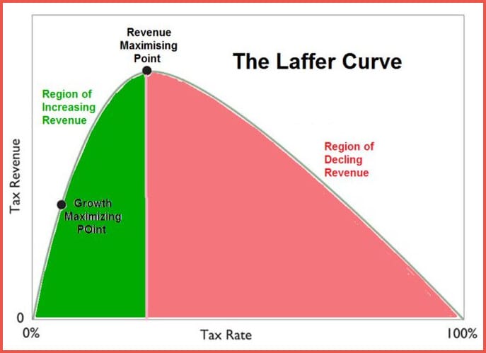 - But if the tax rate were 100%, people would have little reason to work, invest, or report income — because everything they earn would go to taxes. Revenue would again fall very low.