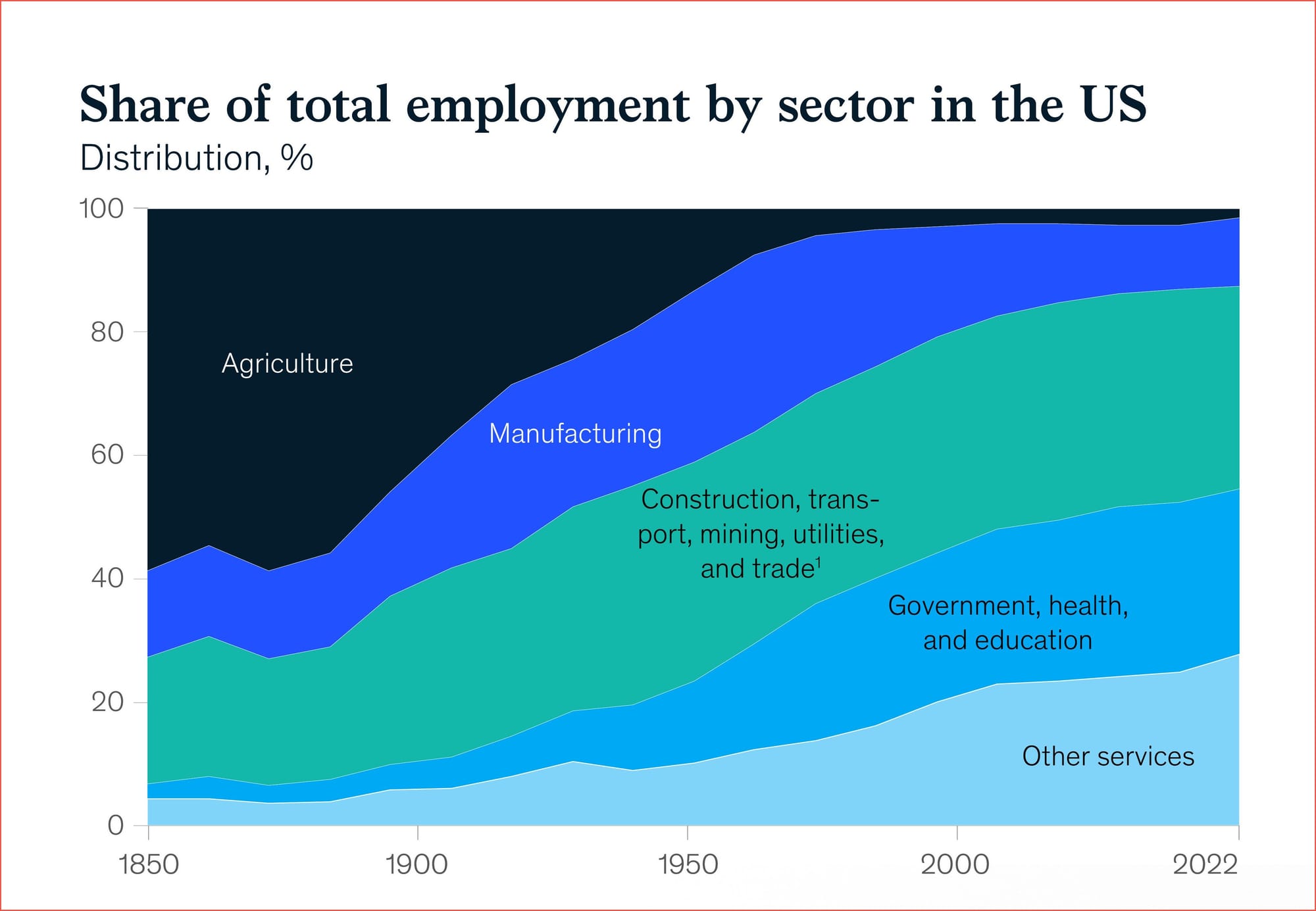 McKinsey data show one of history’s biggest economic shifts: in 1925 most workers farmed; today only a small fraction do. Productivity gains moved labor into manufacturing and now overwhelmingly into services — reshaping cities, incomes, and politics.