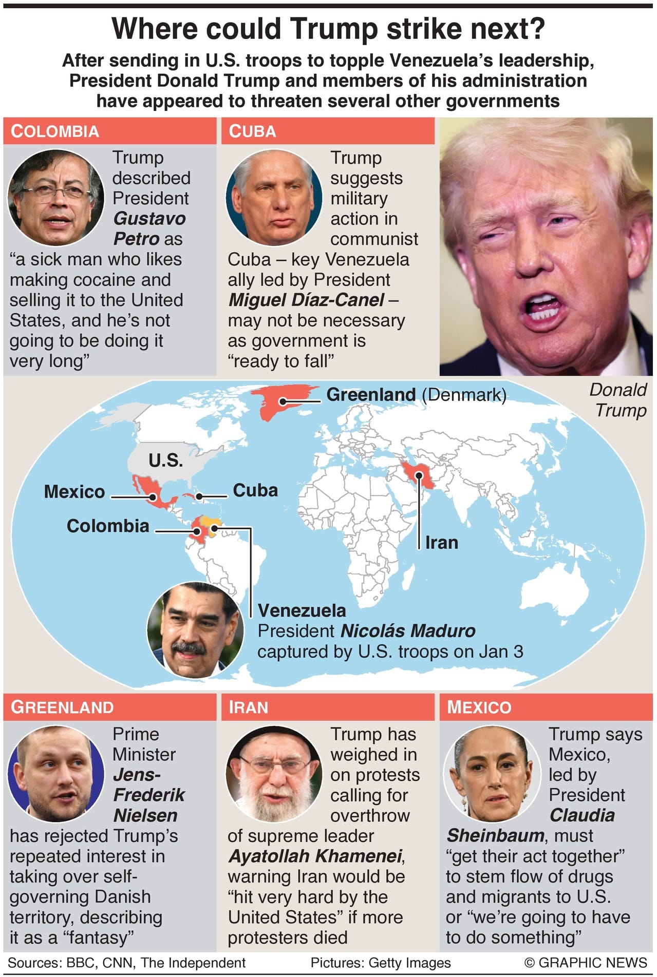 This infographic reflects how global media have interpreted President Trump’s recent statements following the arrest of Venezuelan leader Nicolás Maduro, grouping several countries into a single narrative. It captures perception rather than policy, illustrating how rhetoric is being framed abroad rather than outlining actual U.S. strategic intent.