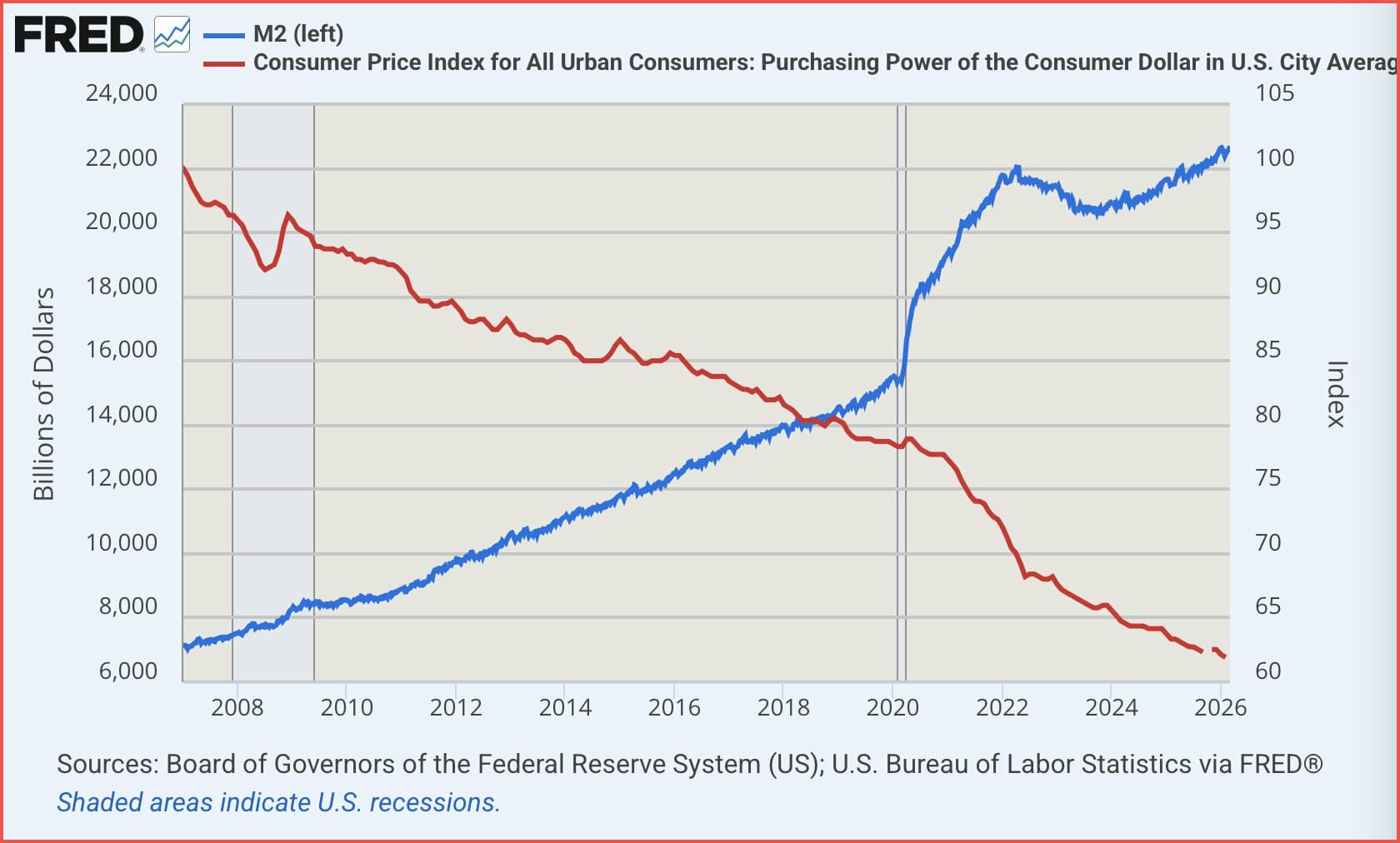 Since 2008, U.S. M2 money supply has roughly tripled, while the purchasing power of the dollar has fallen about 38%. (M2 includes cash, checking and savings deposits, and other easily accessible money.)