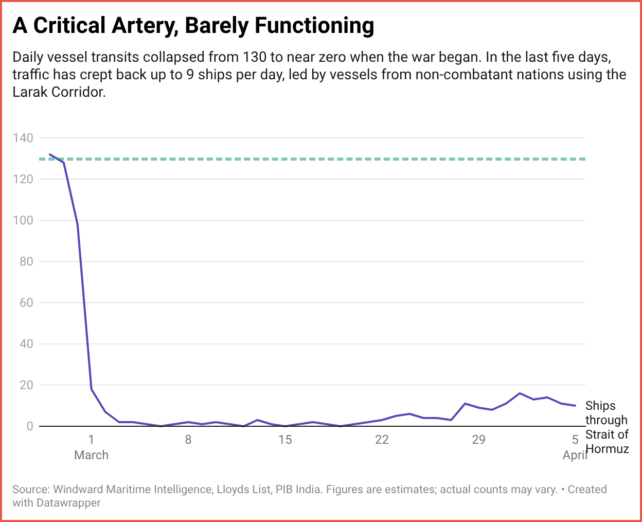 The Strait of Hormuz, a waterway that carries roughly one-fifth of global oil and LNG, is no longer operating freely. Daily traffic has collapsed from nearly 130 vessels before the Israel-US attack on Iran to just a fraction. These days, just a handful of transits occur each day, many of them selective or Iranian-linked. Insurance costs have surged. War-risk premiums have climbed to several percent of a vessel’s value, making commercial shipping nearly unaffordable for many.