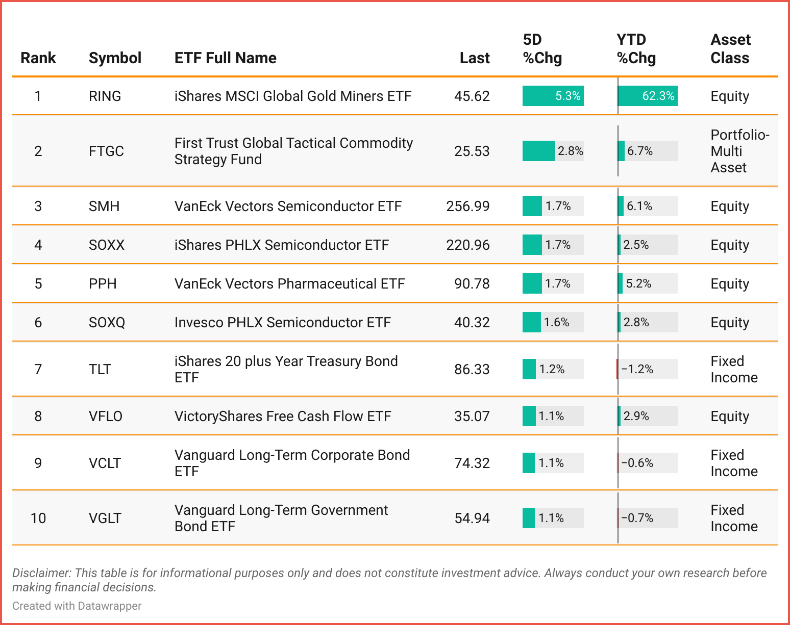 Tickers: RING | FTGC | SMH | SOXX | PPH | SOXQ | TLT | VFLO |VCLT | VGLT