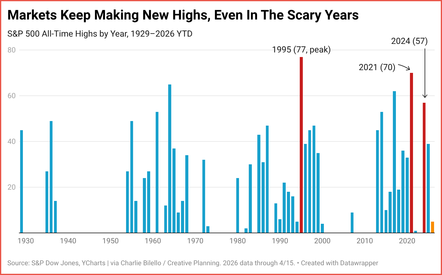 The S&P 500 closed at a record 7,022.93 on Wednesday — its first all-time high since January — even as the US naval blockade of the Strait of Hormuz entered its second week. It's a pattern that shows up again and again in the data. The index has posted new highs in 50 of the last 98 years, often in the years investors remember as the scariest: 33 during the 2020 pandemic, 57 during the 2024 election, 77 in 1995 after a brutal bond rout. Markets, as the saying goes, climb a wall of worry.