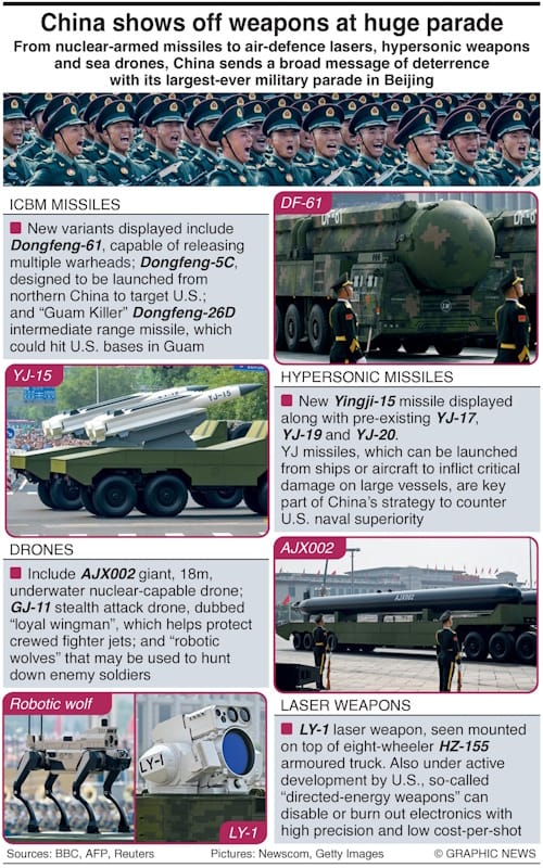 From nuclear-armed missiles to air-defence lasers, hypersonic weapons and sea drones, China sends a broad message of deterrence with its largest-ever military parade in Beijing.