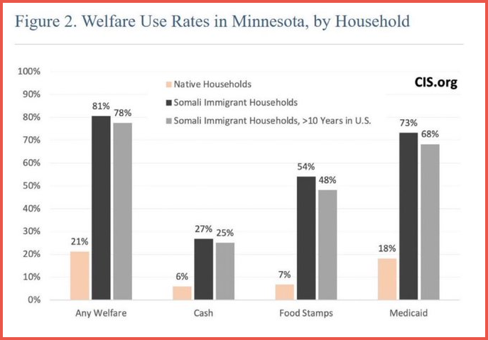A breakdown of welfare use shows large gaps between native households and Somali immigrant households, including those residing in the U.S. for over 10 years.