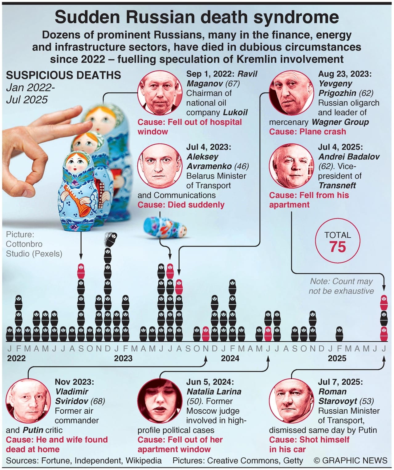 Dozens of prominent Russians, many in the finance, energy, and infrastructure sectors, have died in dubious circumstances since 2022 – fueling speculation of Kremlin involvement.
