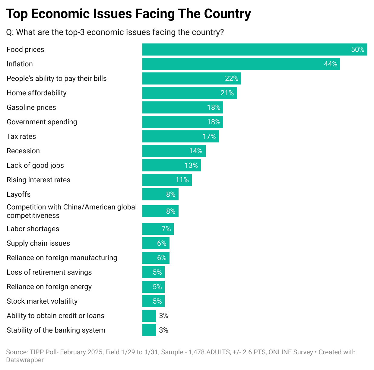 Food prices (50%), inflation (44%), and people’s ability to pay their bills (22%) are among the top three economic issues facing Americans.