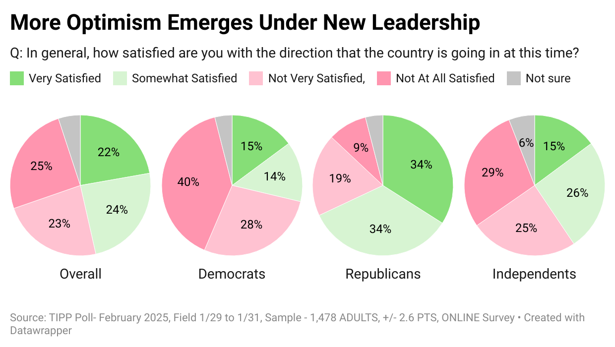 The latest TIPP Poll shows Americans have mixed feelings about the country’s direction, though optimism is rising under the new leadership. 46% of respondents are satisfied, while 48% are dissatisfied. Republicans are the most optimistic, with 68% expressing satisfaction, while Democrats are the least satisfied, with the same numbers dissatisfied. Independents fall in between, with 41% satisfied and 54% dissatisfied.