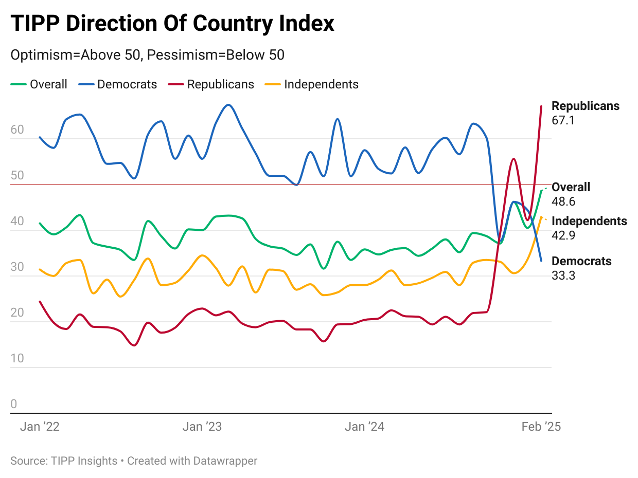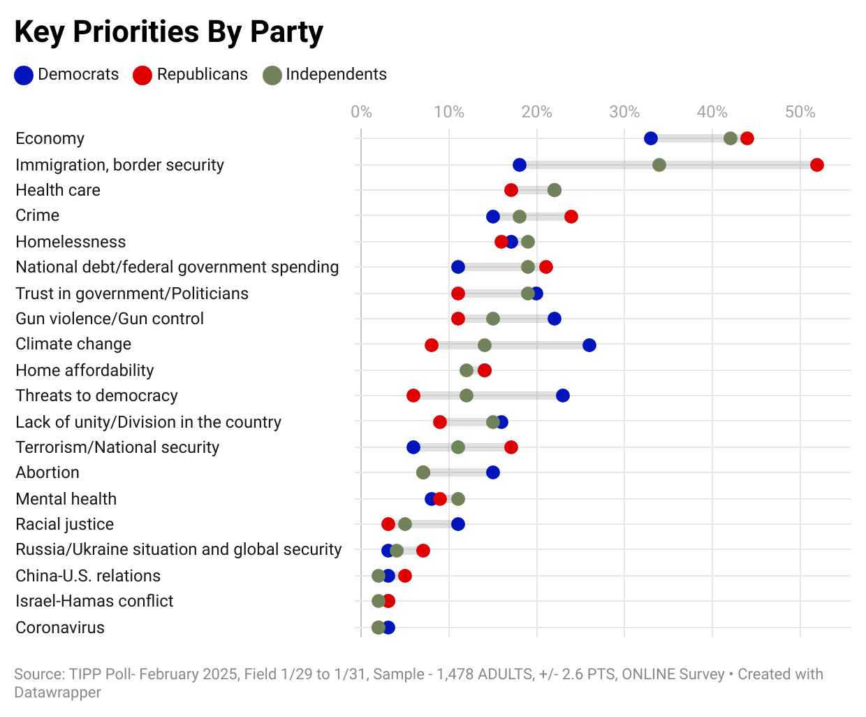 Americans remain focused on the core issues—the economy, immigration, and government spending. Optimism is rising, but partisan divides persist—Republicans are upbeat, Democrats have turned pessimistic, and Independents are in the middle. Whether this optimism endures will hinge on how effectively leadership navigates the pressing challenges ahead.