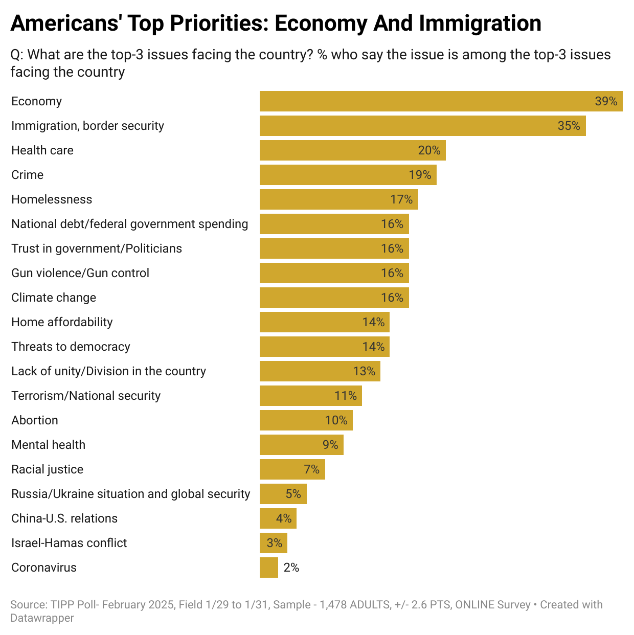 Republicans, on the other hand, prioritized immigration and border security (52%), the economy (44%), crime (24%), national debt/government spending (21%), and terrorism/national security (17%).