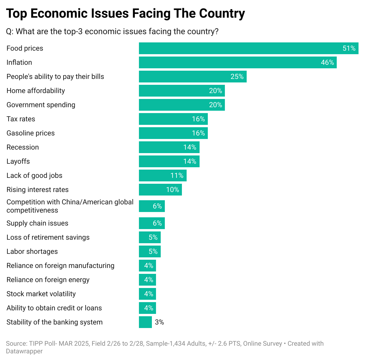 Food prices (51%), inflation (46%), and people’s ability to pay their bills (25%)are among the top three economic issues facing Americans.