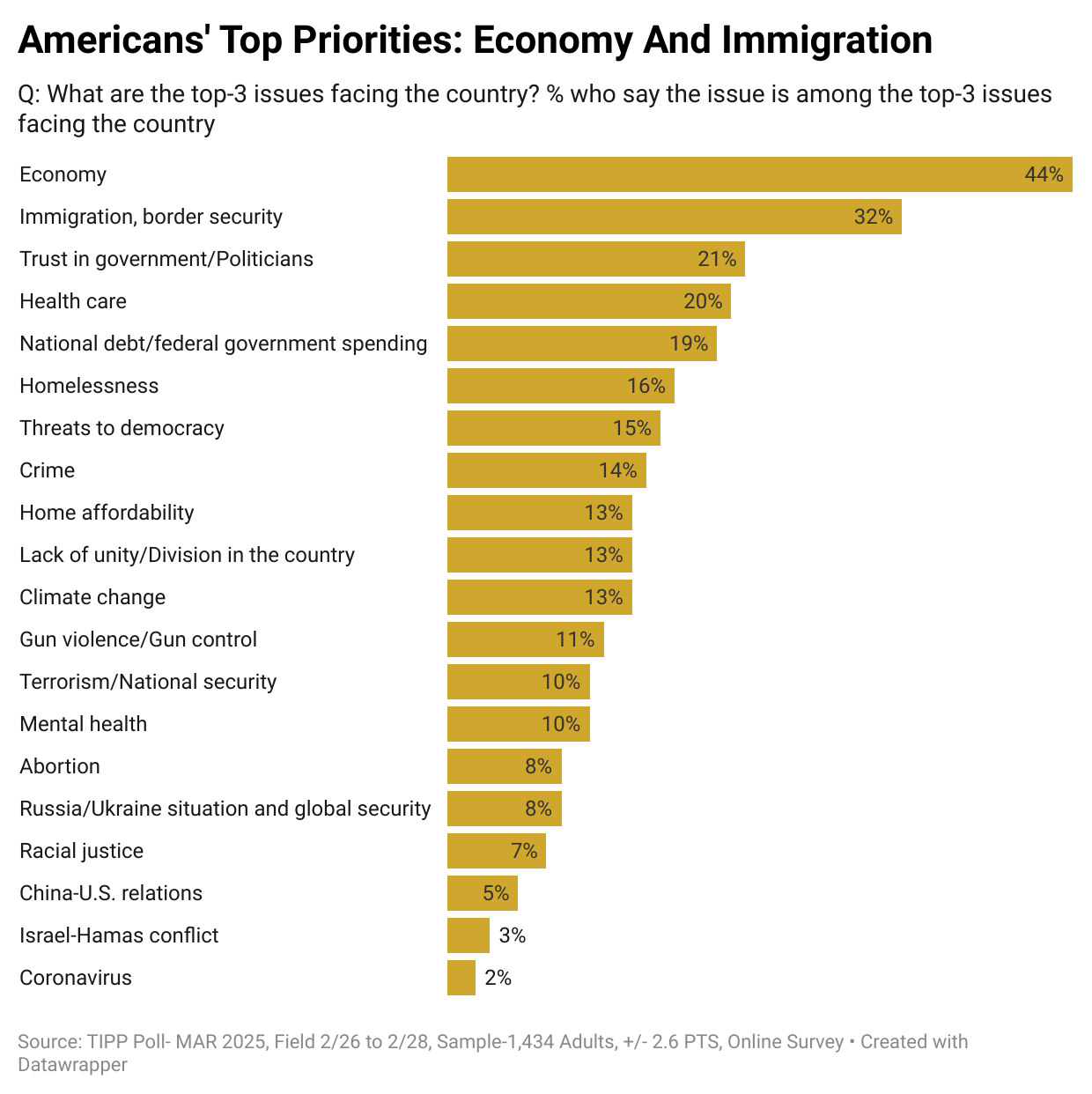 These results are from the latest nationwide TIPP Poll, which was completed in late February and surveyed 1,434 Americans. The poll asked participants, "What are the top three issues facing the country?"