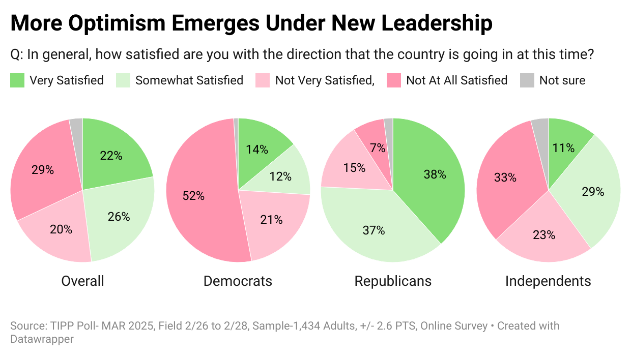 The latest TIPP Poll shows Americans have mixed feelings about the country’s direction, though optimism is rising under President Trump’s leadership. 48% of respondents are satisfied, while 49% are dissatisfied. Republicans are the most optimistic, with 75% expressing satisfaction, while Democrats are the least satisfied, with 73% being dissatisfied. Independents fall in between, with 40% satisfied and 56% dissatisfied.