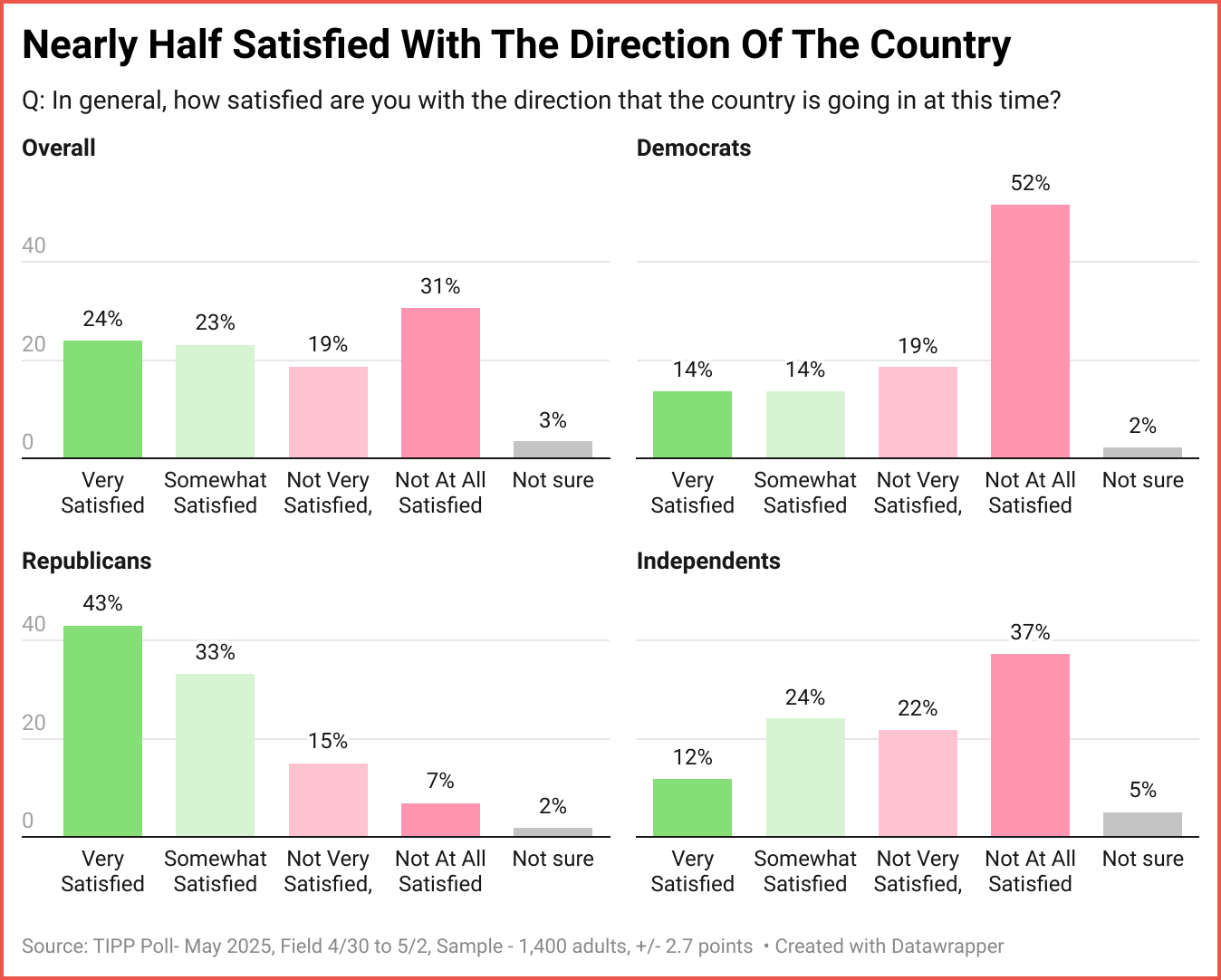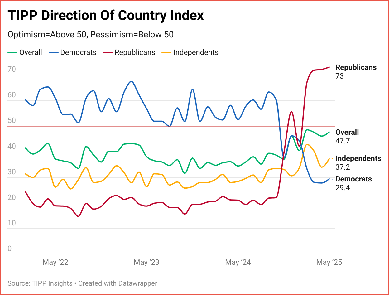 Each month, the TIPP Poll probes the general sentiment about the country’s direction using the survey question, "In general, how satisfied are you with the direction that the country is going in at this time?"