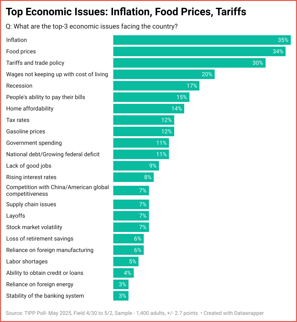 Inflation (35%), food prices (34%), and tariffs and trade policy (30%) are among the top three economic issues facing Americans.