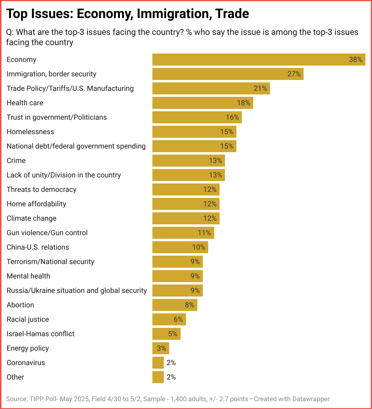 These insights come from the latest nationwide TIPP Poll of 1,400 Americans, conducted in early May. Respondents were asked, “What are the top three issues facing the country?”