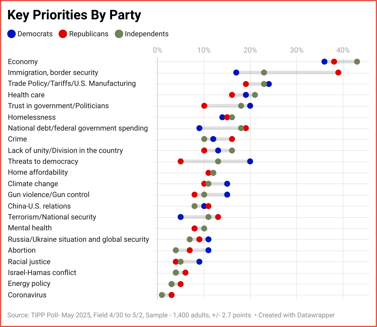 Independents tracked more closely with Republicans, prioritizing the economy (43%), immigration (23%), and trade policy (23%), alongside health care (21%) and federal spending (18%).