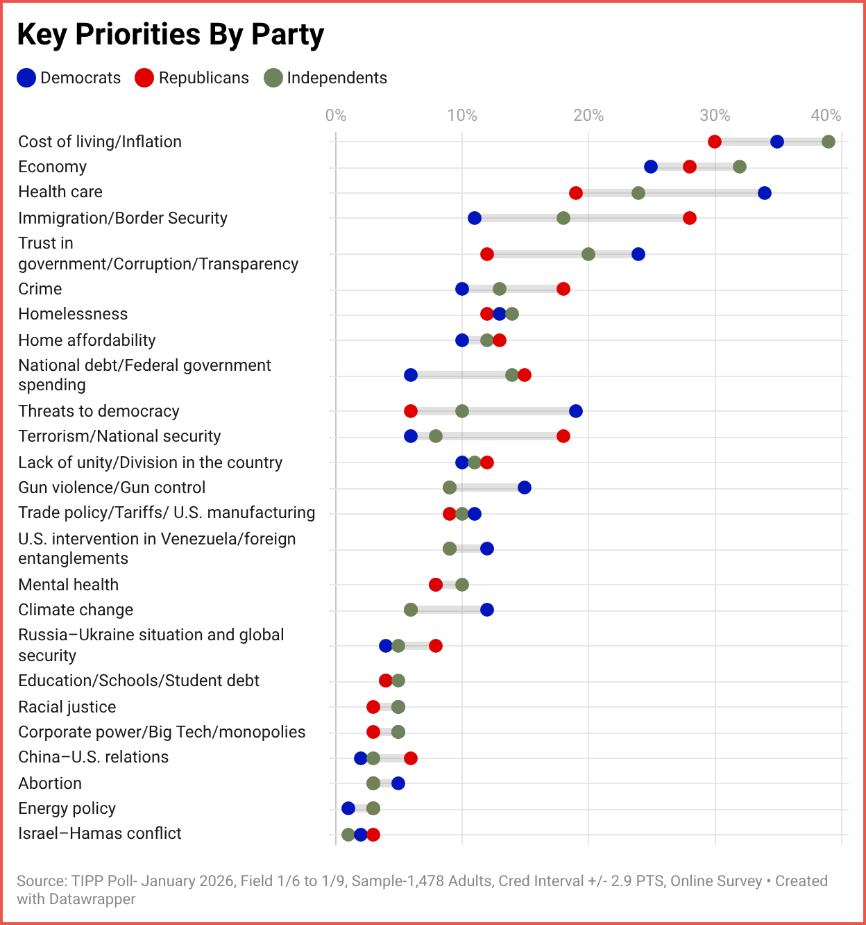 A year into his second term, President Trump faces a country focused less on rhetoric and more on results. Americans’ top concerns center on the cost of living and inflation, followed by the economy and health care, according to the latest nationwide TIPP Poll. Immigration and border security rank next, reflecting continued pressure for enforcement and control, while trade policy and U.S. manufacturing draw modest attention relative to top economic concerns.