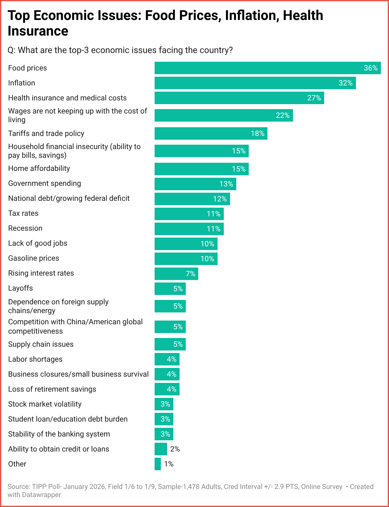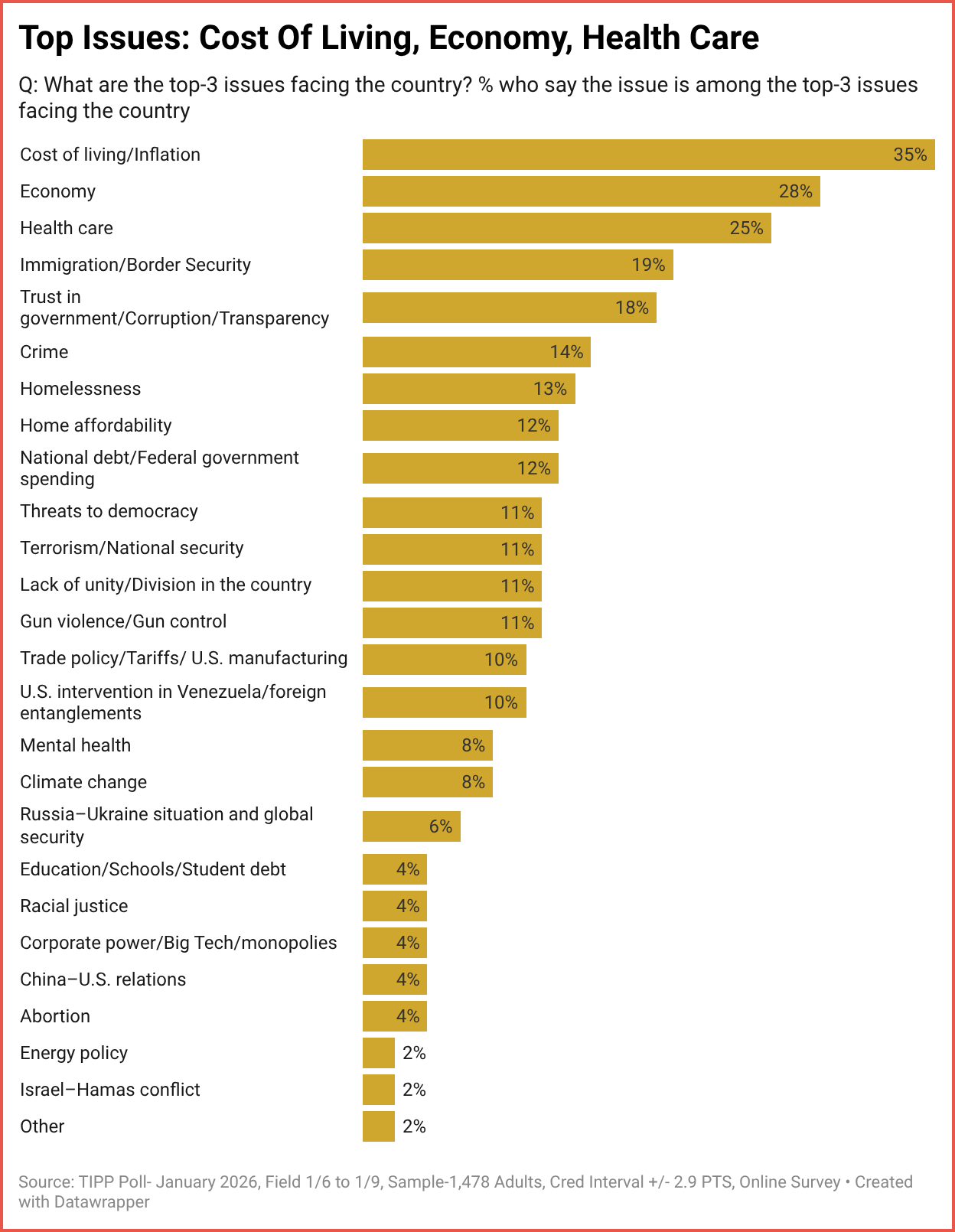 These findings are from the latest nationwide TIPP Poll, conducted in early January among 1,478 adults. Respondents were asked: “What are the top three issues facing the country?”
